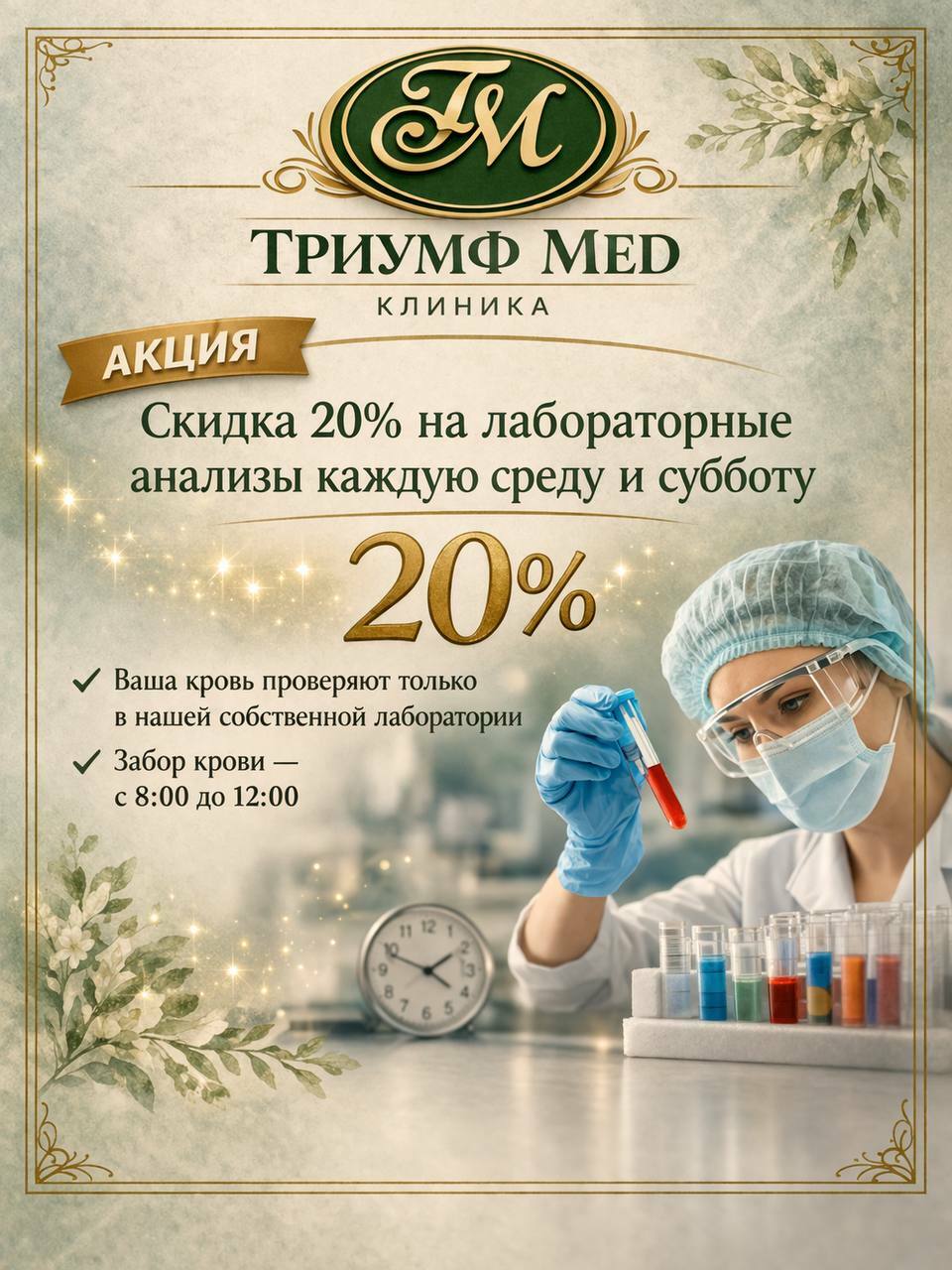 Скидка 20% на все виды лабораторных анализов каждую среду и субботу.